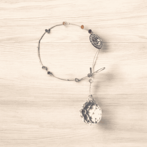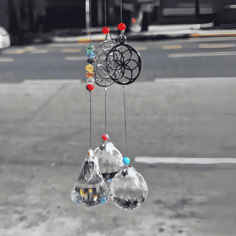 Atrapasol de 50cm. de largo aprox. con cable de acero, detalles en colores de los chakras, aplique en fundicio y cairel de cristal reflectante.