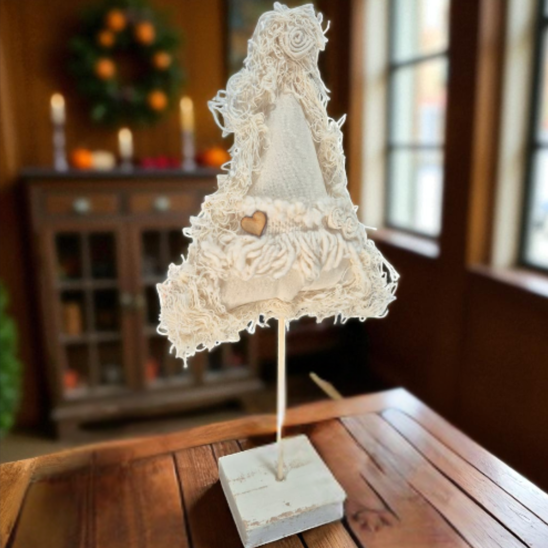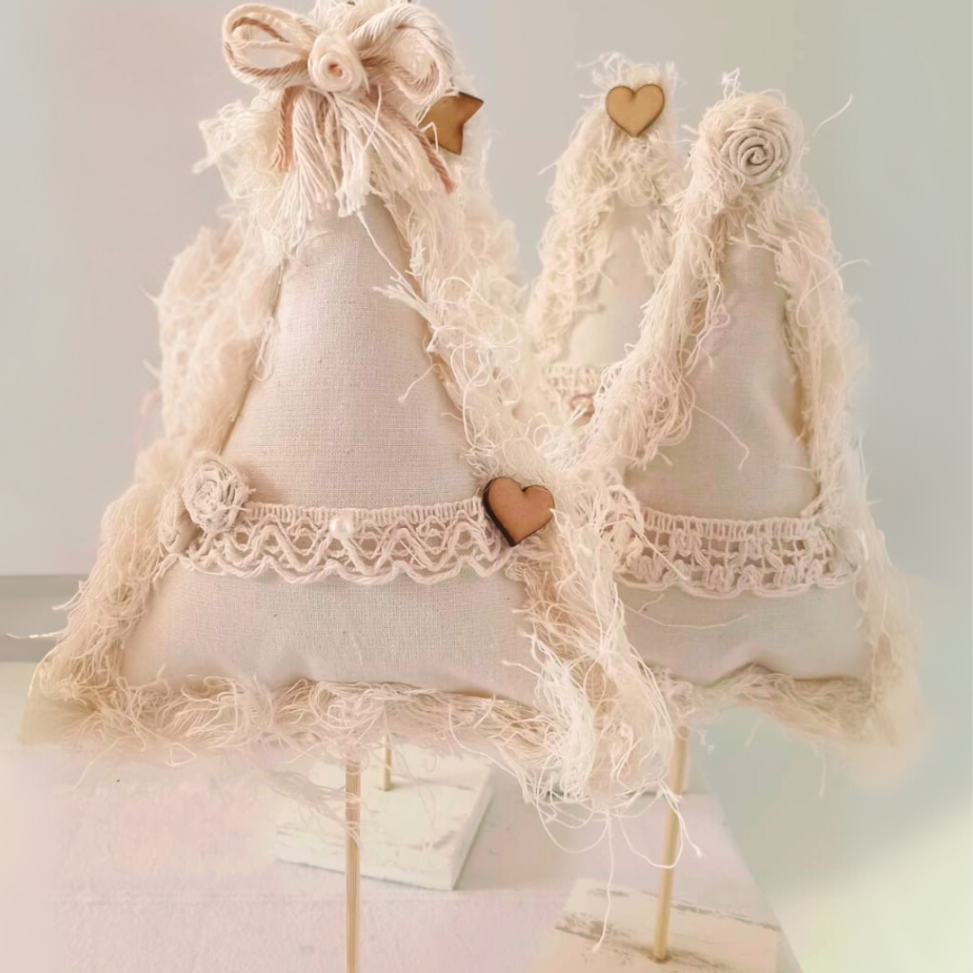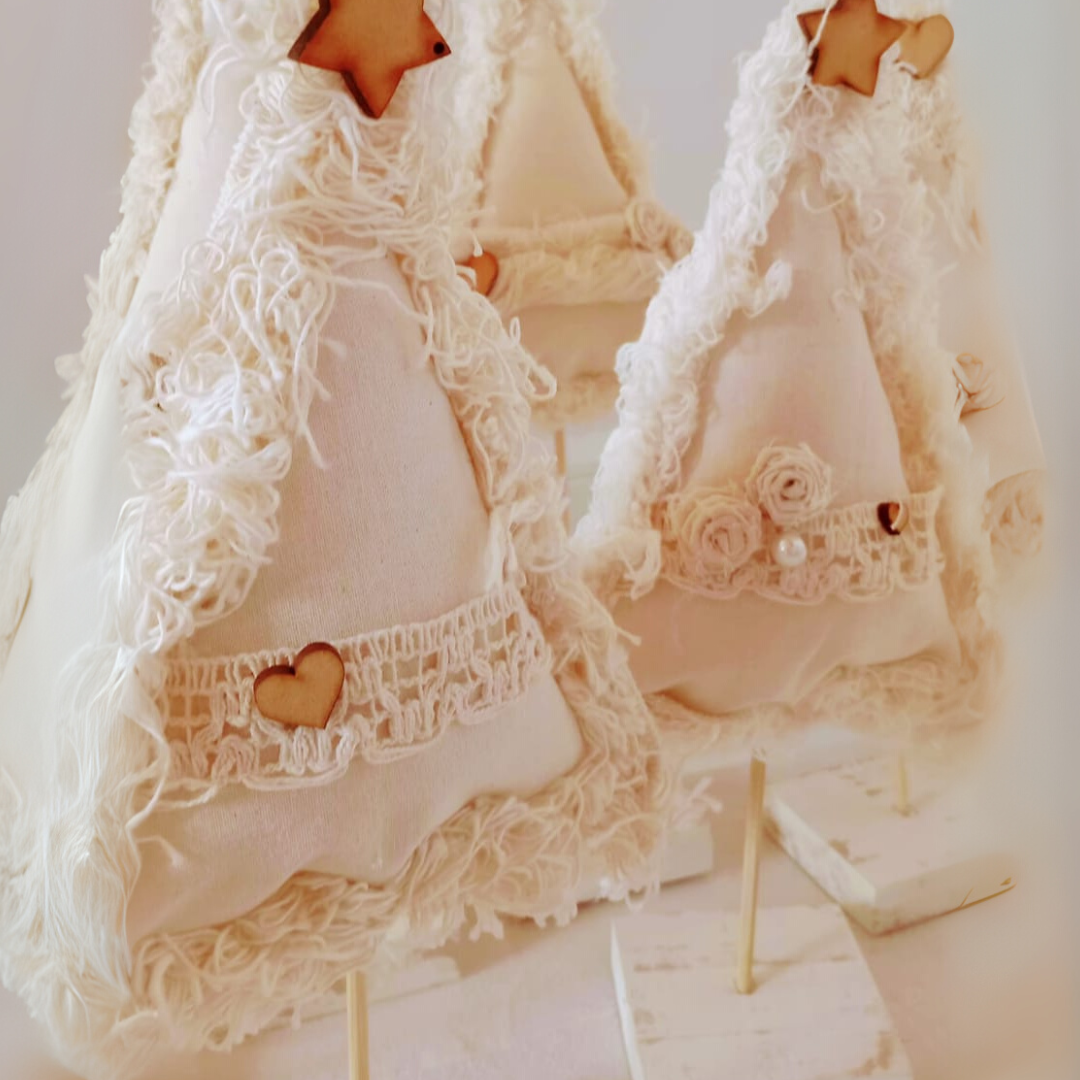 Arbol de navidad de finas telas y delicados apliques, estilo nordico, medidas: 30 cm de alto y 15 cm de ancho.