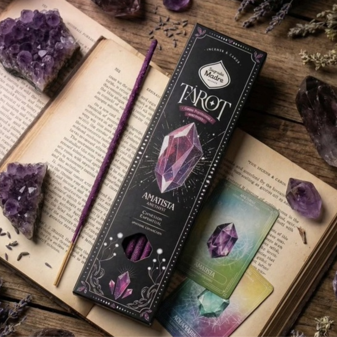 Sahumerios natural de Sagrada Madre motivo Tarot de gemas preciosas. En cada caja vas a encontrar 6 varillas y 2 cartas troqueladas al azar pertenecientes a los 22 Arcanos Mayores coleccionables.