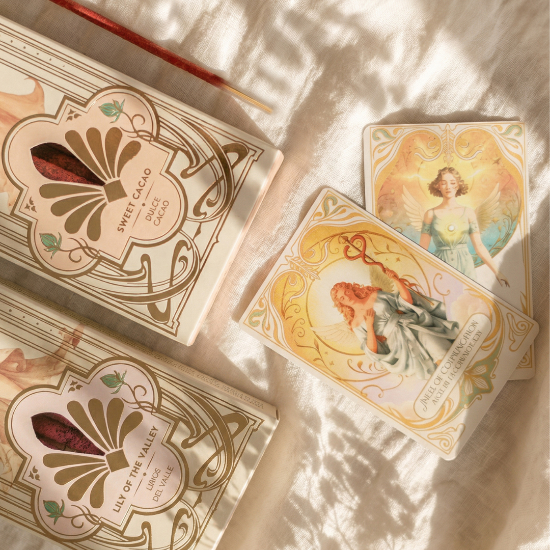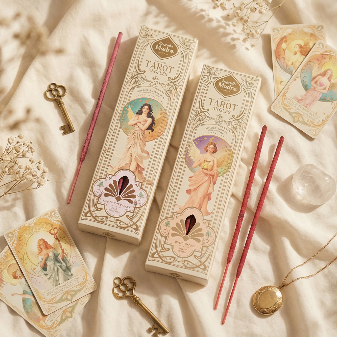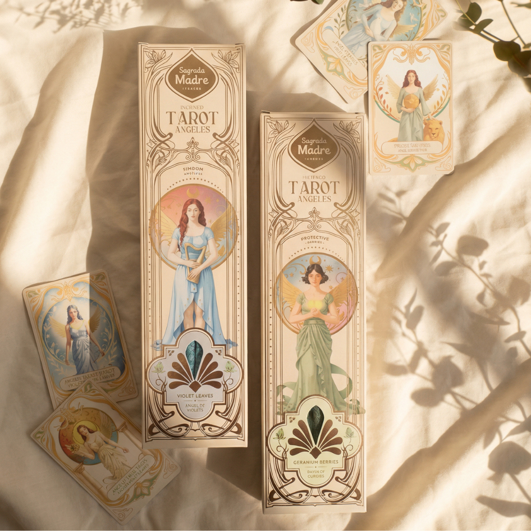 Sahumerios natural de Sagrada Madre motivo Tarot de Angeles. En cada caja vas a encontrar 6 varillas y 2 cartas troqueladas al azar pertenecientes a los 22 Arcanos Mayores coleccionables.