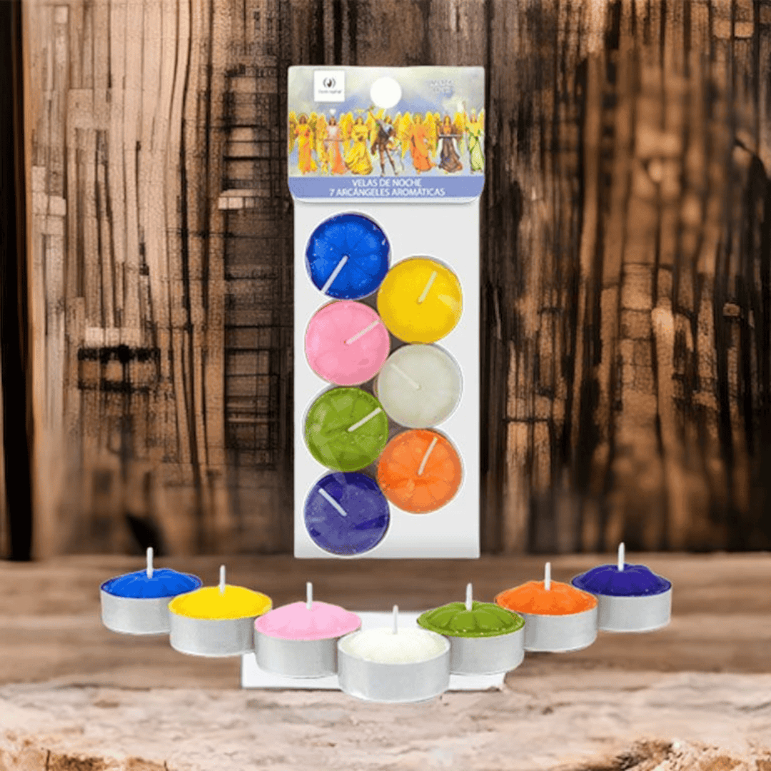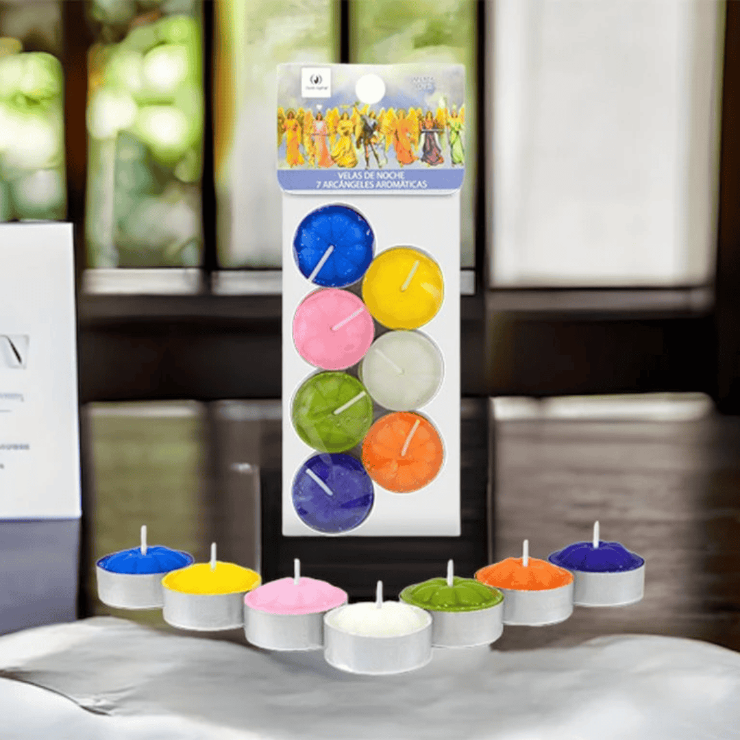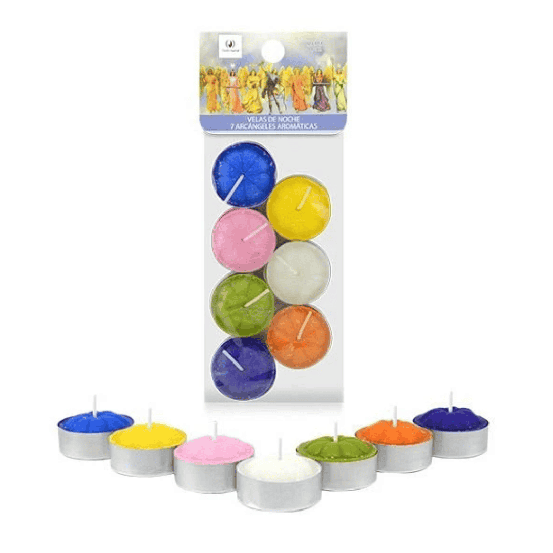 Pack de 7 velas de noche relacionadas con el color de los 7 Arcángeles principales, para pedirles algo puntual o simplemente generar una intencion.